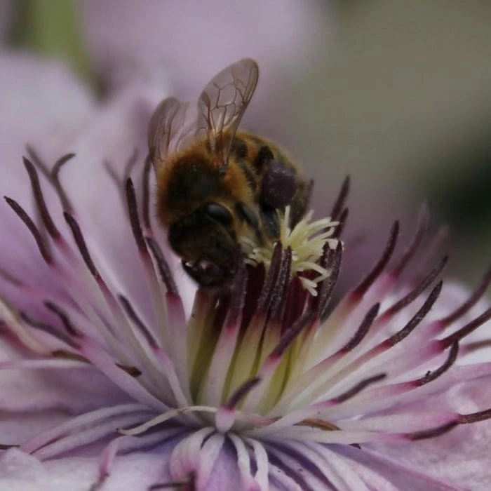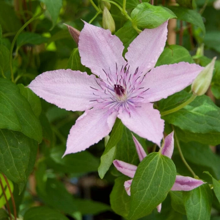 - A compact, large flowering clematis with masses of pink/lilac flowers up to 15cm across, with contrasting red anthers