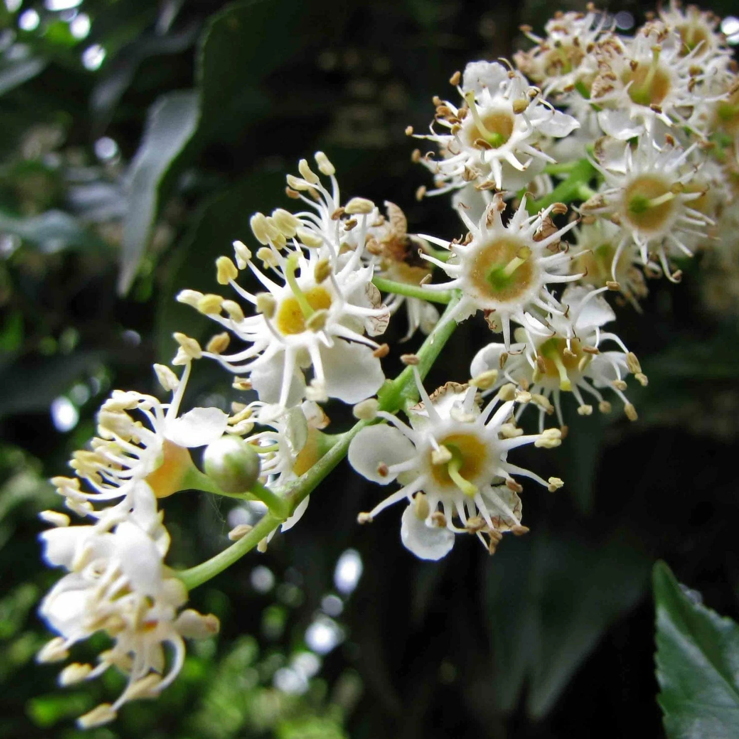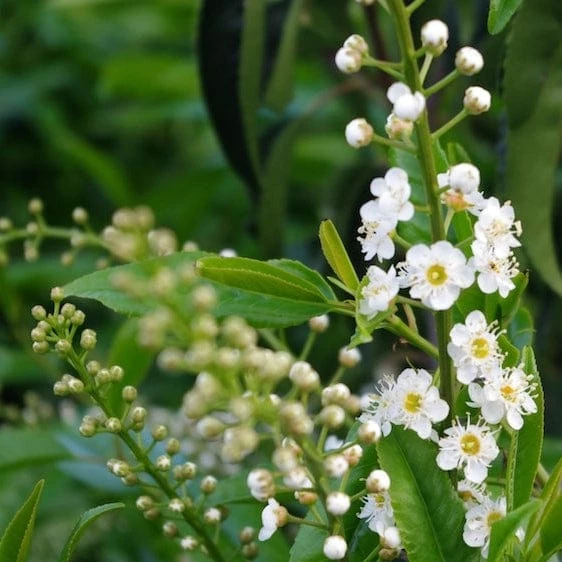 - A neater variety of Portugal Laurel, this delightful shrub bears long, narrow green leaves on red-purple stems. In June, the plant is covered in small white flowers, which are followed by small red fruits